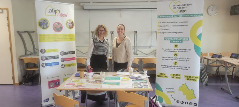Nos Ă©quipes Afiph et Afiph Ă dom’ Ă©taient prĂ©sentes pour rencontrer des Ă©tudiants IDE (Infirmiers DiplĂ´mĂ©s d’État) et AS (Aides-Soignants) et Ă©changer autour des mĂ©tiers du mĂ©dico-social et de l’accompagnement Ă domicile.